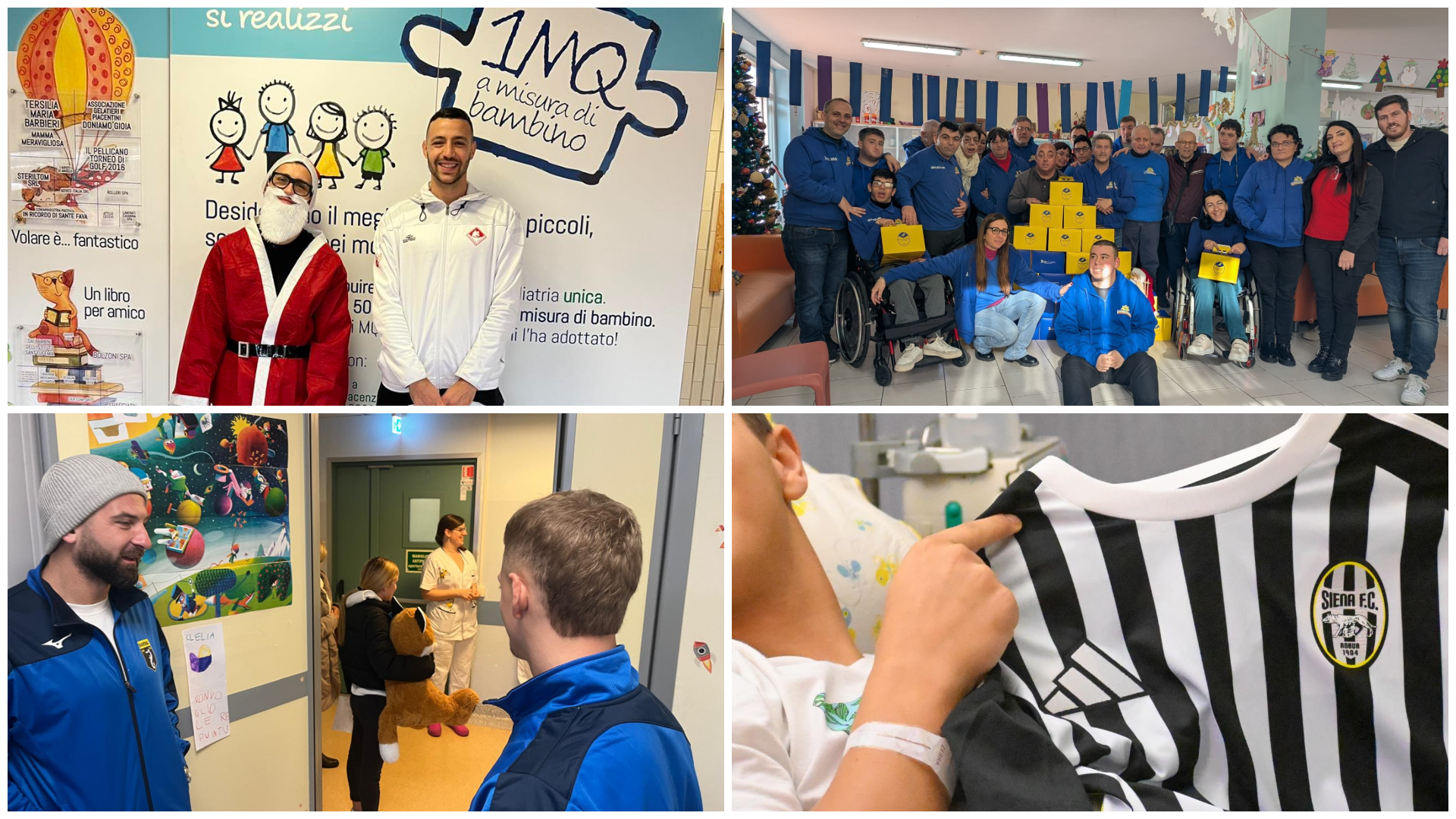 L’Imperia è stato protagonista di una giornata speciale nel reparto pediatrico dell’Ospedale della città. Lo stesso gesto nobile compiuto dalla Cairese al “Gaslini” di Savona. Il Foligno ha scelto le festività natalizie per dare il via al progetto “Maglie di inclusione” con la formazione Molateam impegnata nel Campionato III livello Umbria-Marche della Divisione Calcio Paralimpico e Sperimentale della FIGC. L’iniziativa del club è nata in collaborazione con la ASLUMBRIA 2, realizzata presso i centri socioriabilitativi gestiti dalle cooperative ElleElle, La Locomotiva e Dinamica Sociale. I giocatori del Siena e dell’Orvietana vestiti da Babbo Natale hanno fatto una lieta sorpresa ai piccoli pazienti dell’Azienda ospedaliero-universitaria Senese ed al nido “Girotondo” di Orvieto.